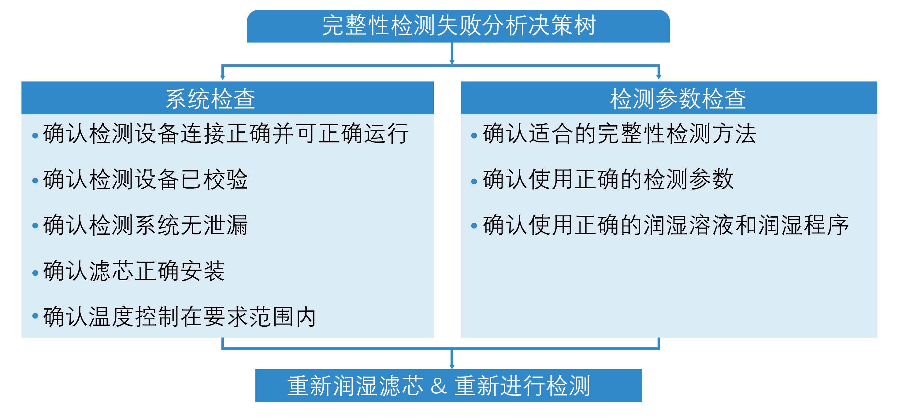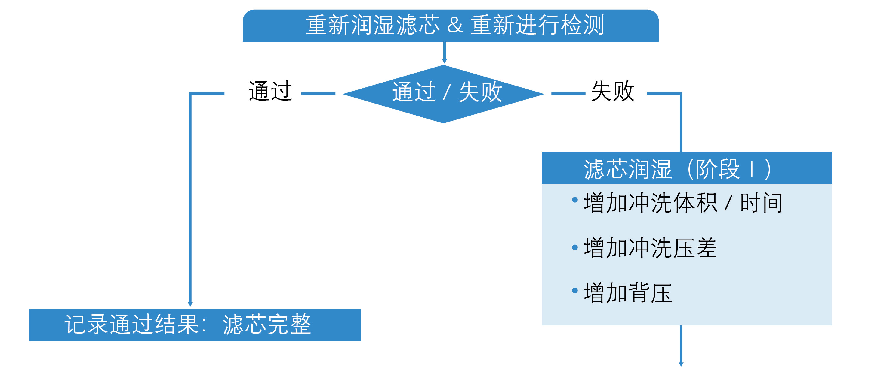第二步: 按(图一)进行排查后,完整性检测通过,则记录滤芯完整。如果失败,按(图二)进行排查,我们可以通过增加冲洗体积/时间、增加冲洗压力、增加背压的方式(润湿阶段1)来进一步润湿滤芯。