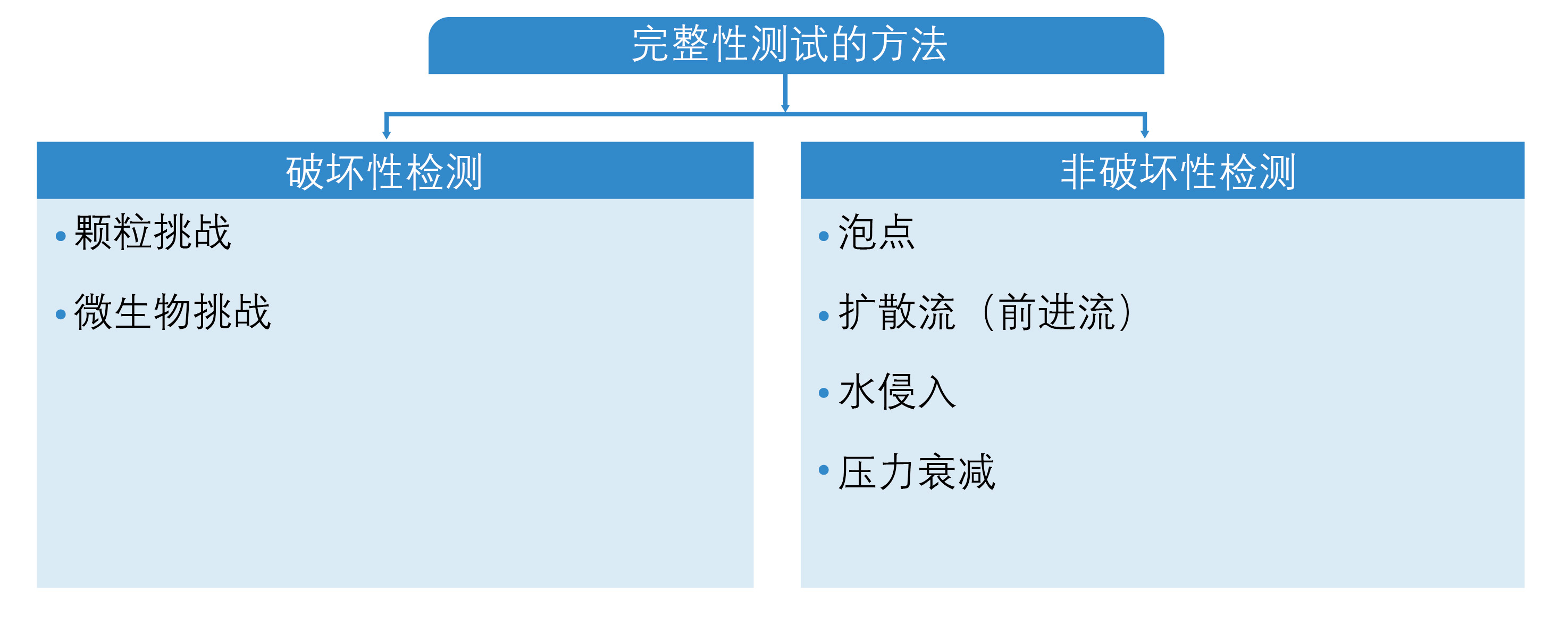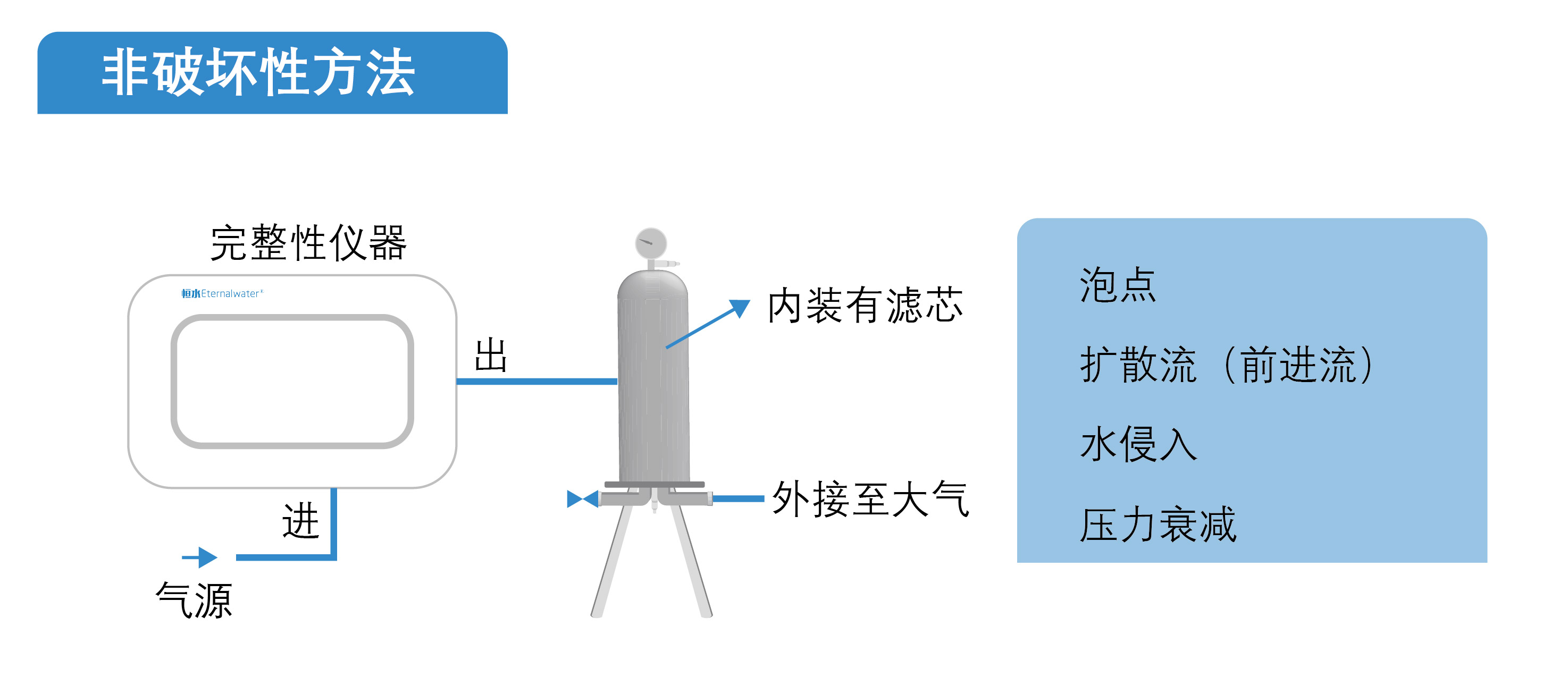 通常是使用完整性测试仪器,与待测滤器相连接,通过前进流,泡点,水侵入等方法来进行的检测。