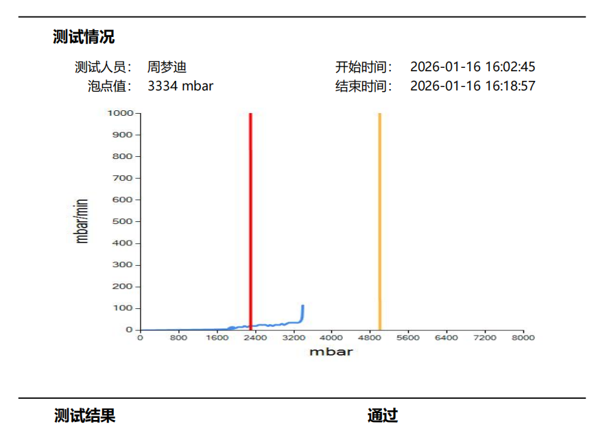 泡点检测的注意的事项 在泡点测试过程中,会有图表的形式显示出来,在我们的质量保证书上会有标注,泡点的数值要达到多少以上,滤芯才会合格。